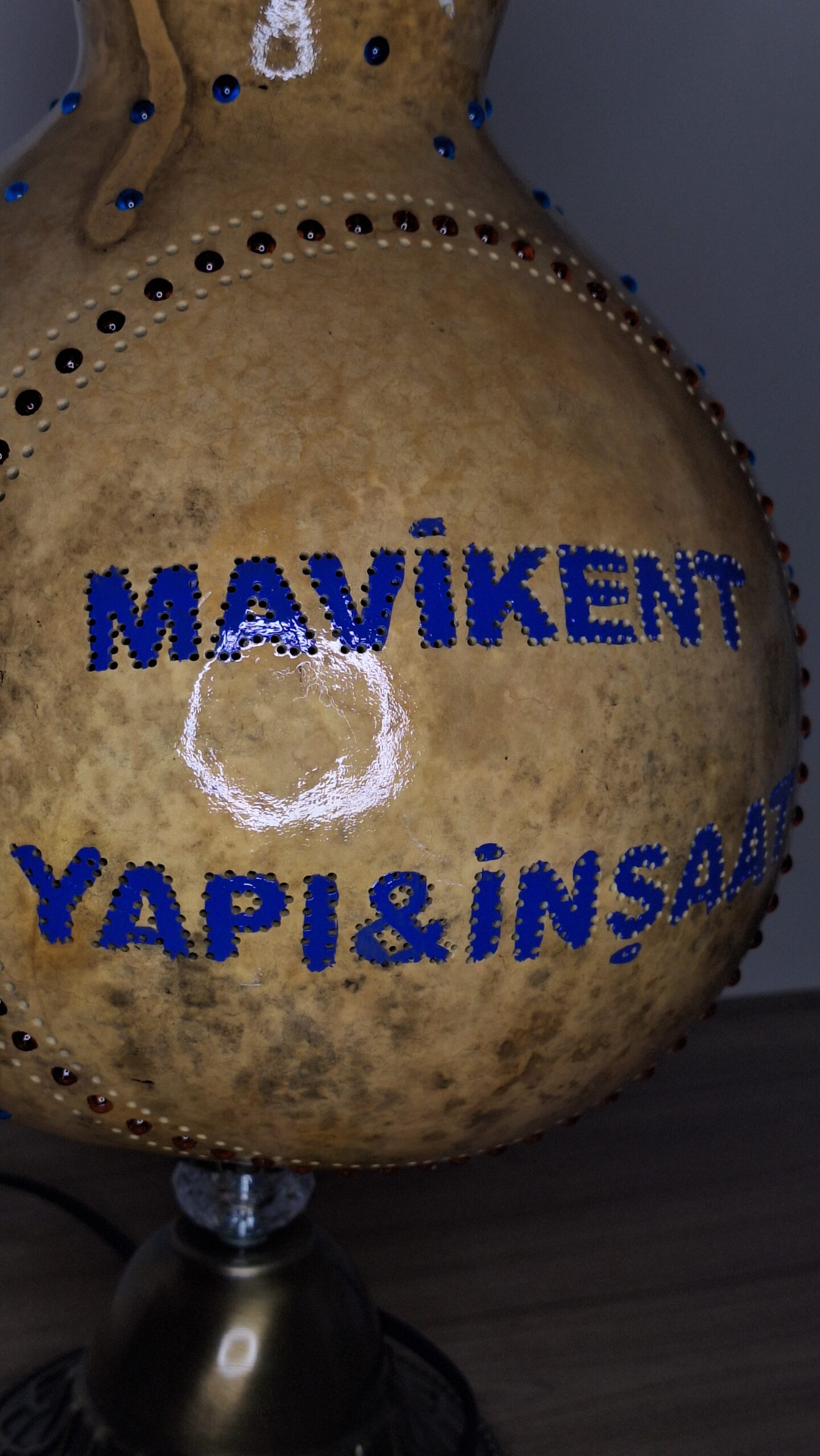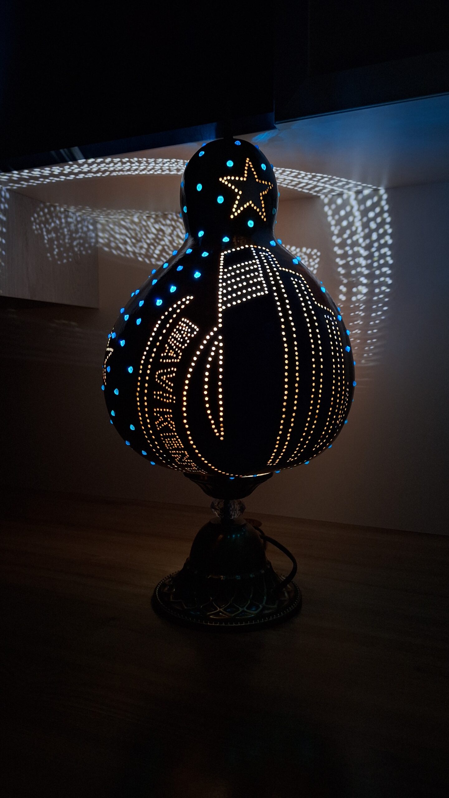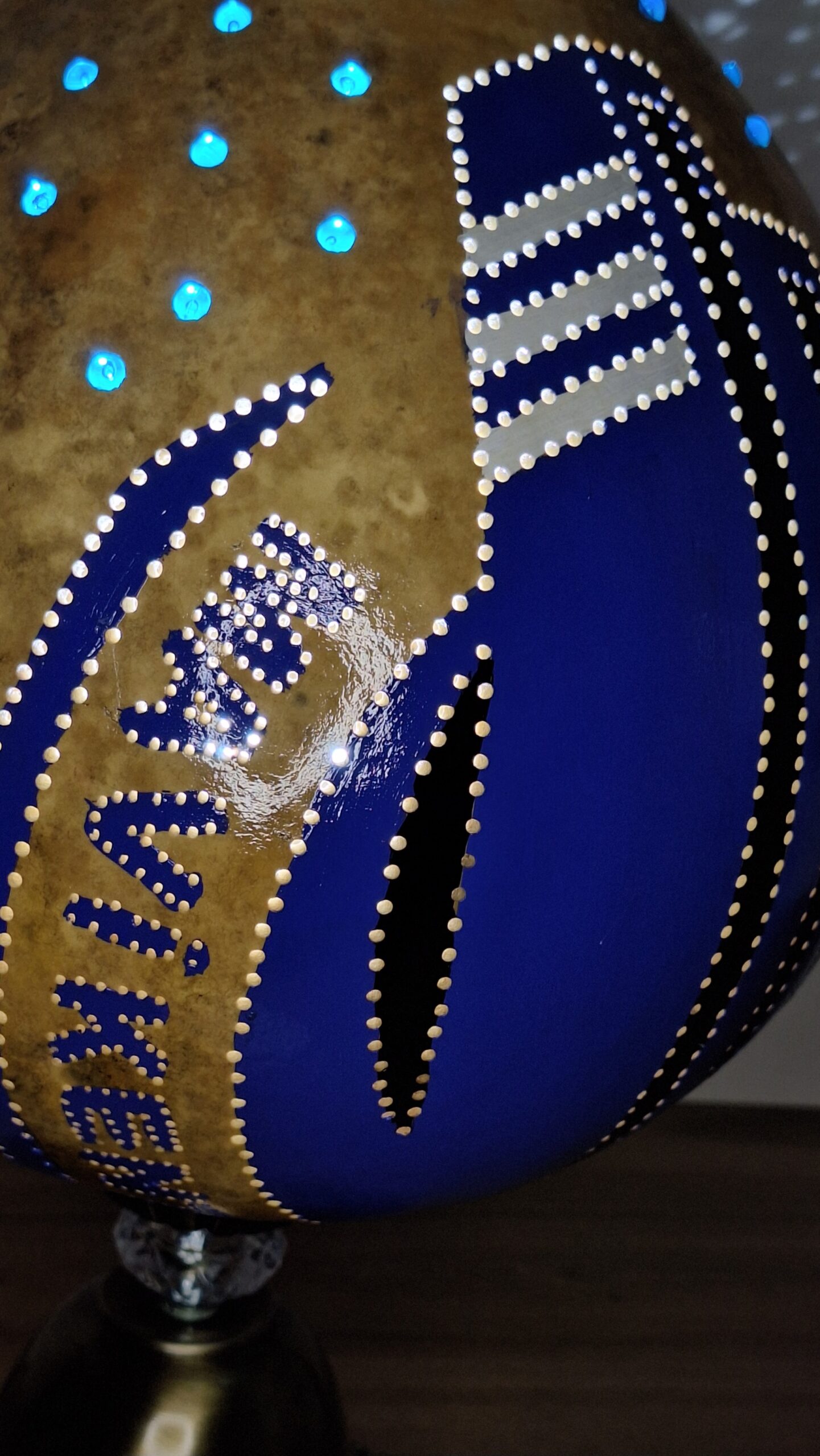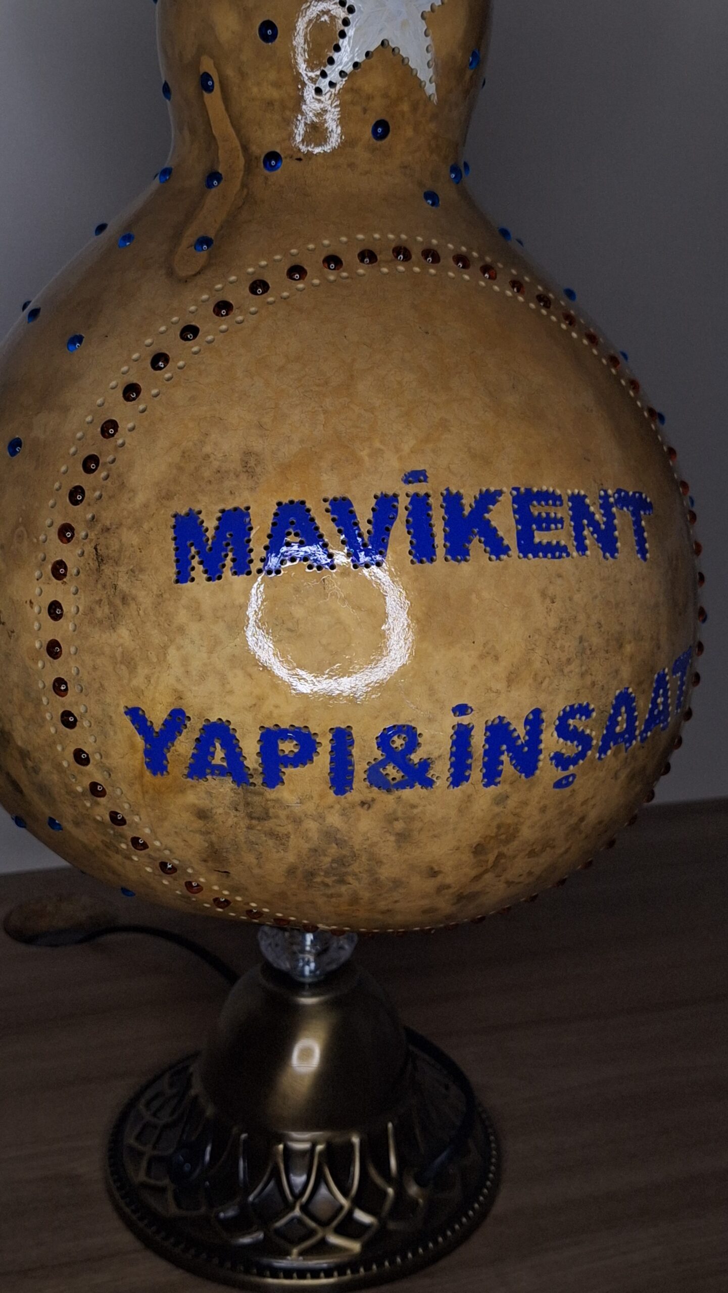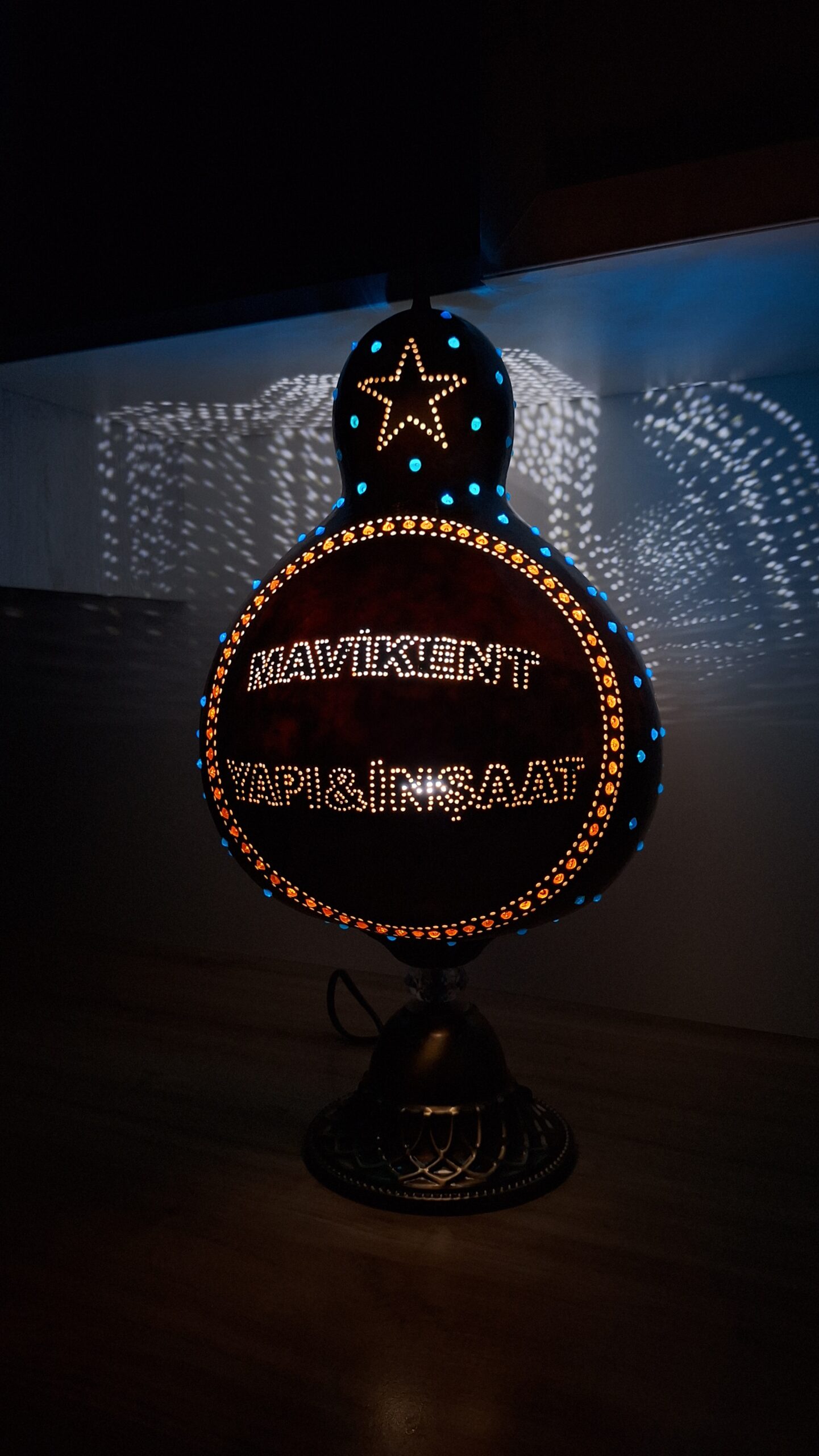 Bu özel tasarım su kabağı abajur, tamamen doğal malzemeden elde üretilmiş ve hiçbir hazır şablon kullanılmadan, teknik çizimle tek tek işlenmiş el yapımı bir sanat eseridir. Üzerindeki motifleri ve mavi boncuk detaylarıyla, adeta gecenin içine kişinin huzurunu taşıyor.