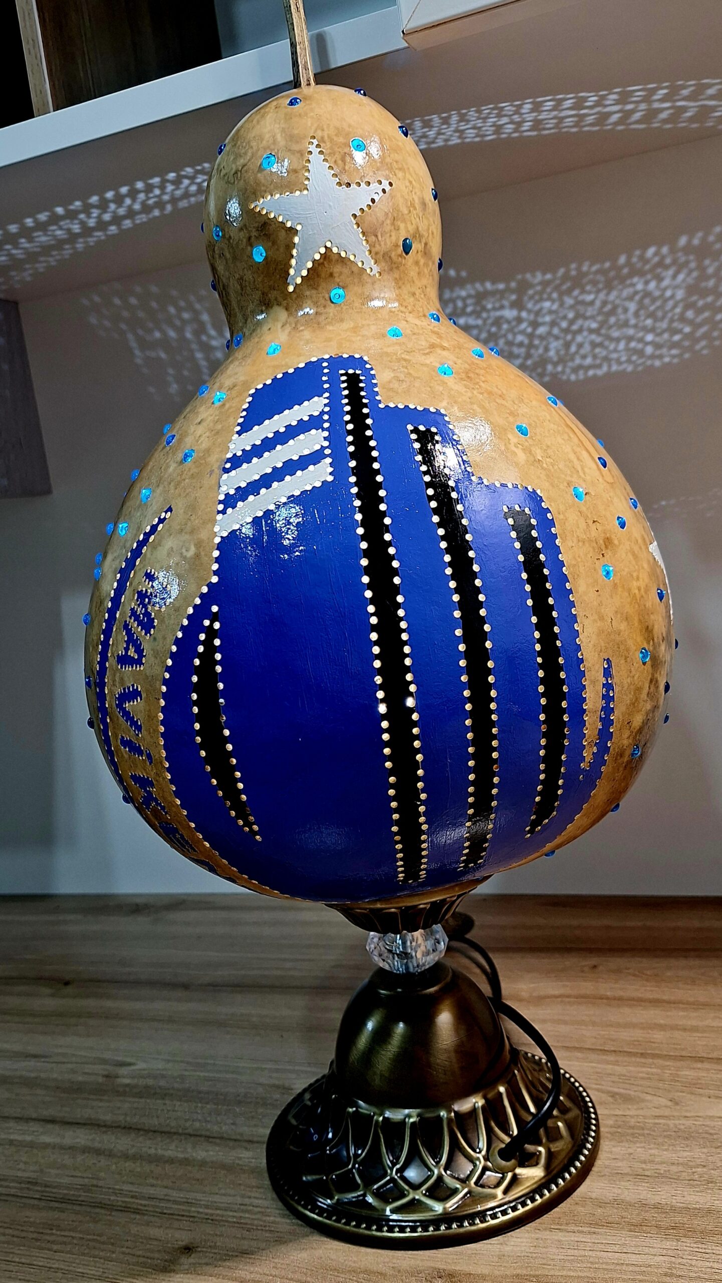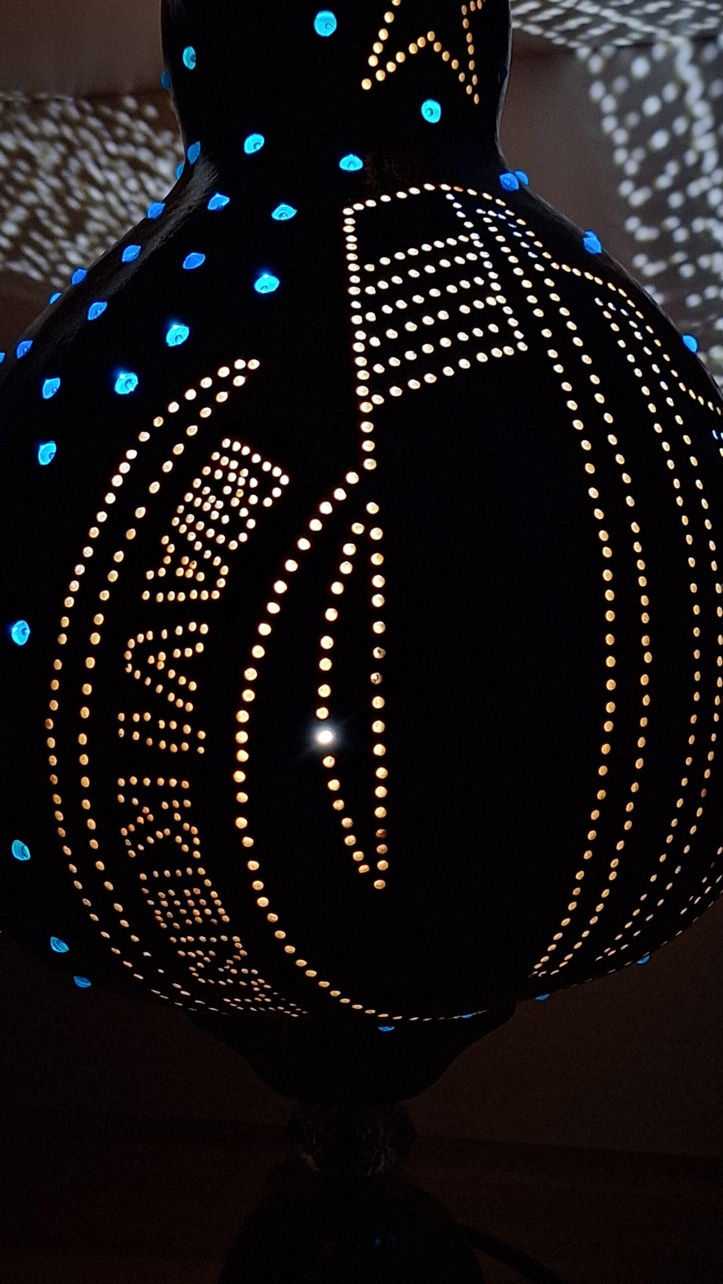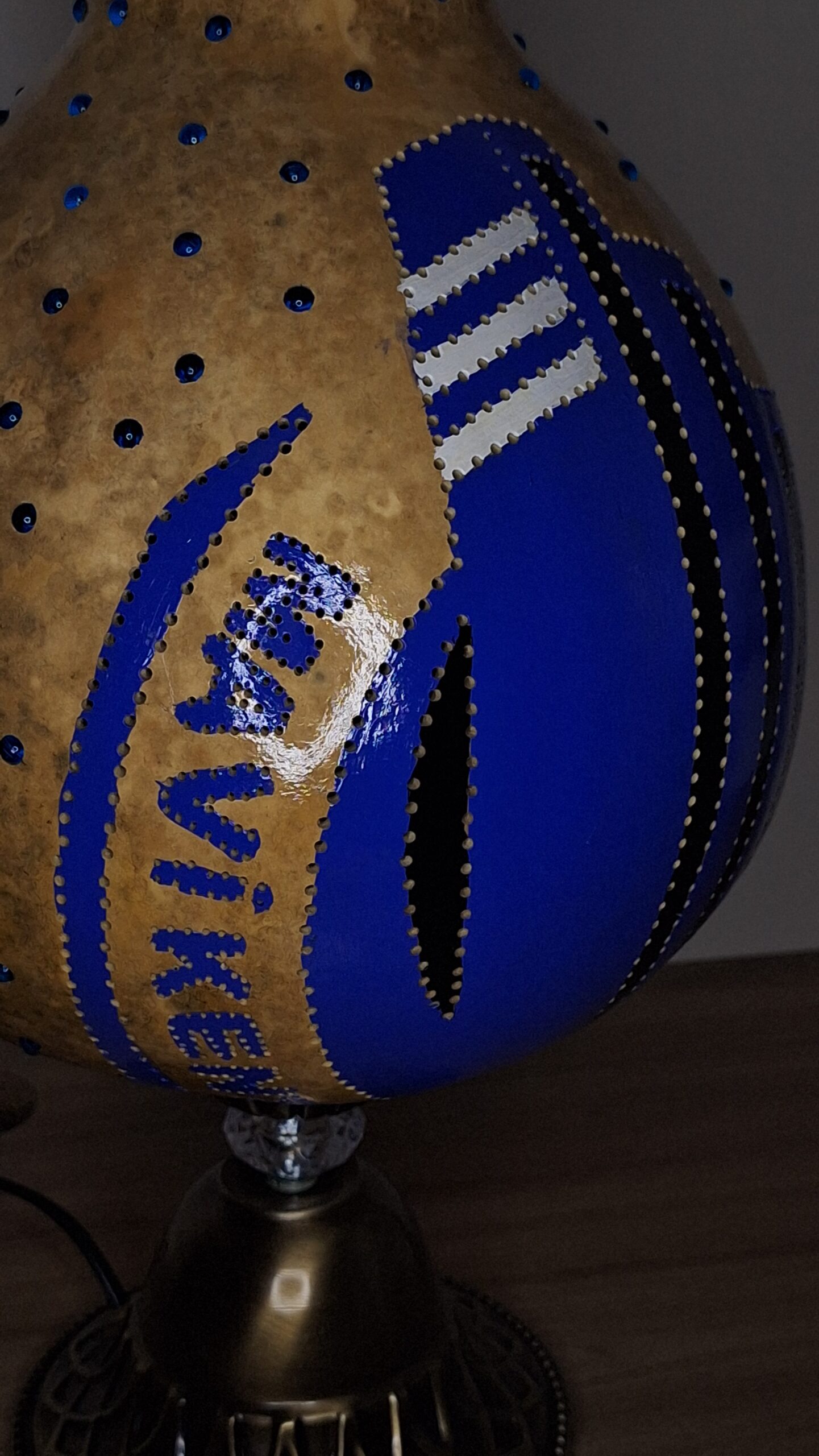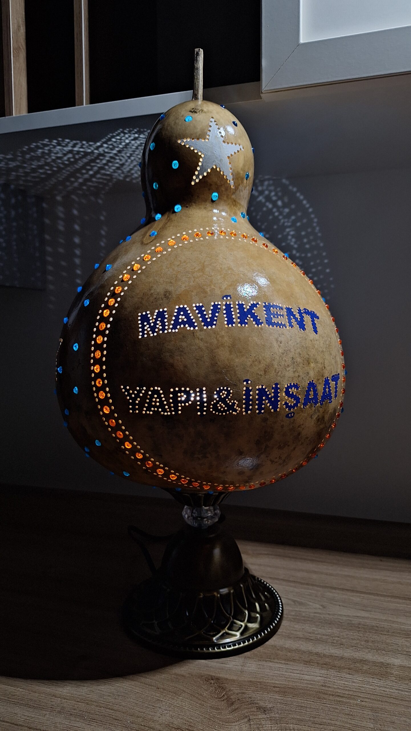 Bu özel tasarım su kabağı abajur, tamamen doğal malzemeden elde üretilmiş ve hiçbir hazır şablon kullanılmadan, teknik çizimle tek tek işlenmiş el yapımı bir sanat eseridir. Üzerindeki motifleri ve mavi boncuk detaylarıyla, adeta gecenin içine kişinin huzurunu taşıyor.