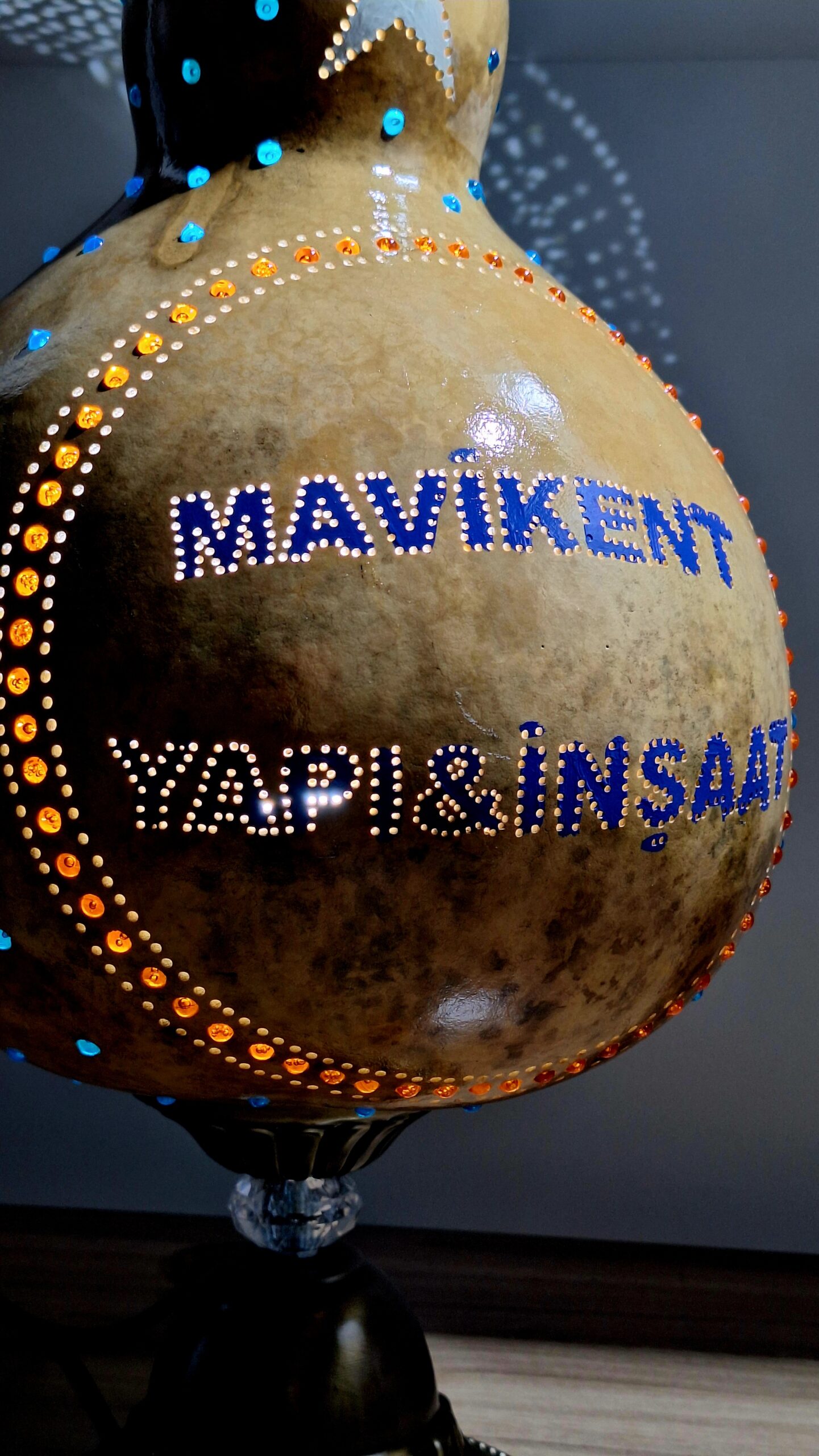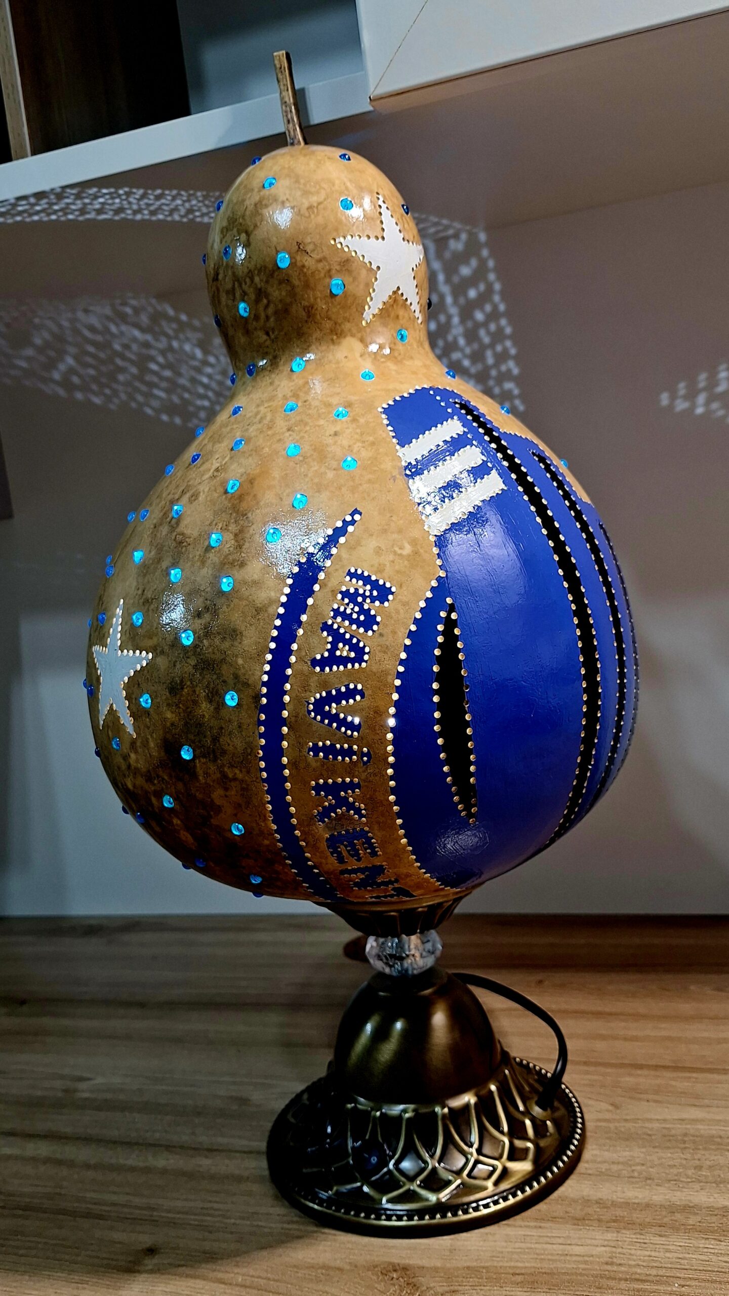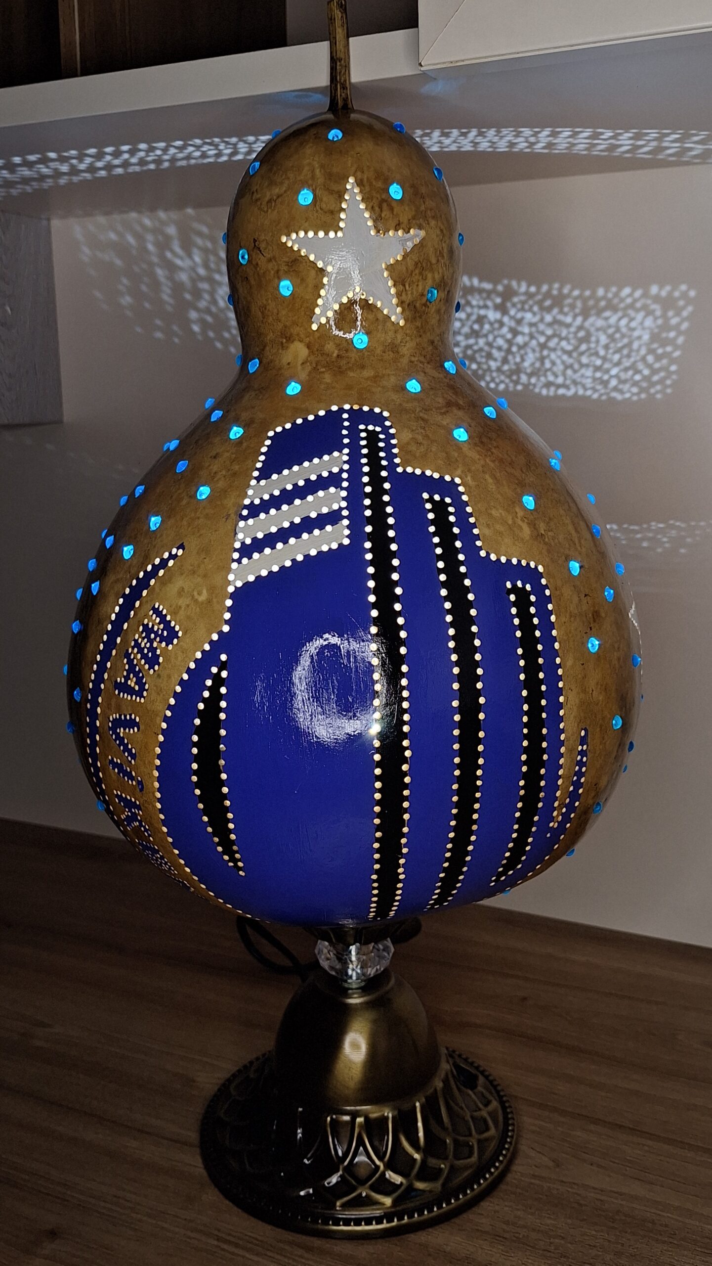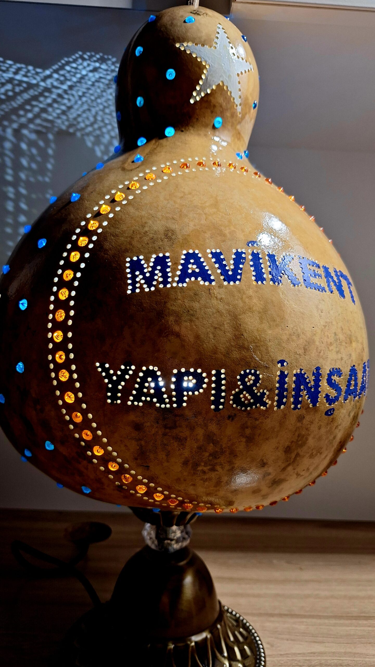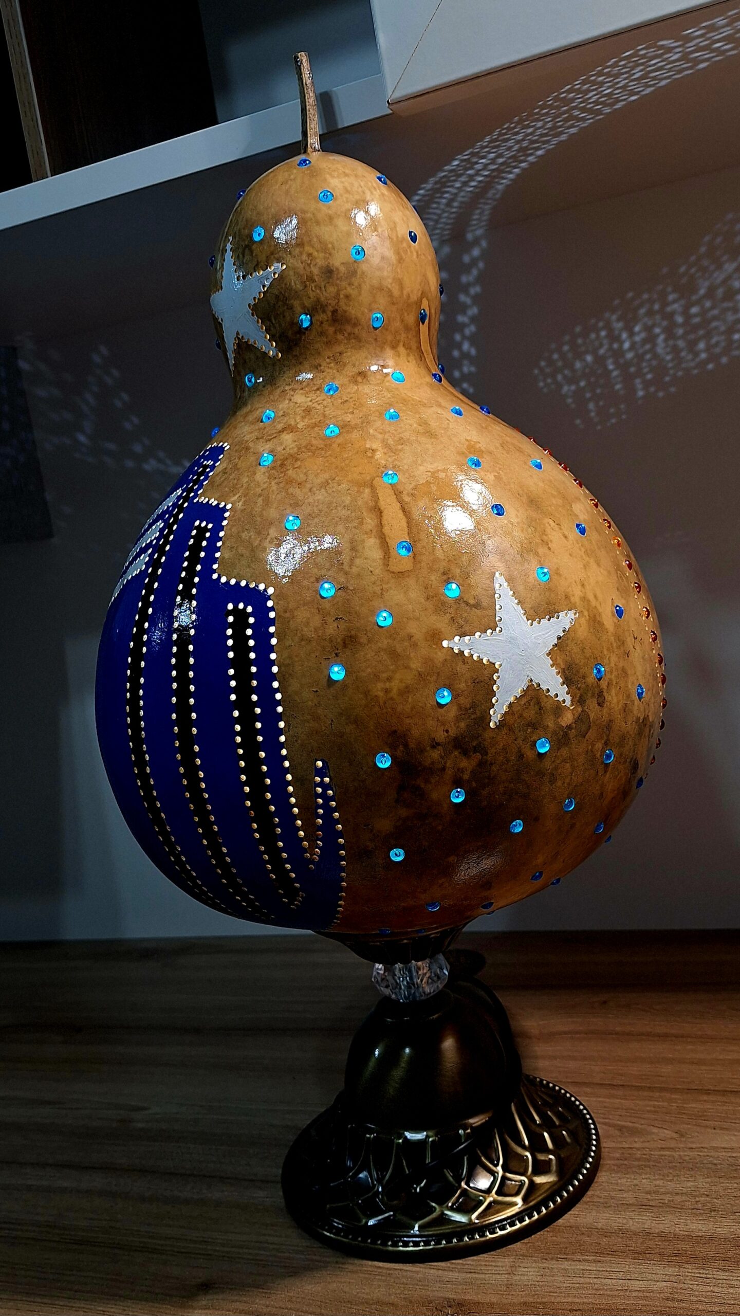 Bu özel tasarım su kabağı abajur, tamamen doğal malzemeden elde üretilmiş ve hiçbir hazır şablon kullanılmadan, teknik çizimle tek tek işlenmiş el yapımı bir sanat eseridir. Üzerindeki motifleri ve mavi boncuk detaylarıyla, adeta gecenin içine kişinin huzurunu taşıyor.