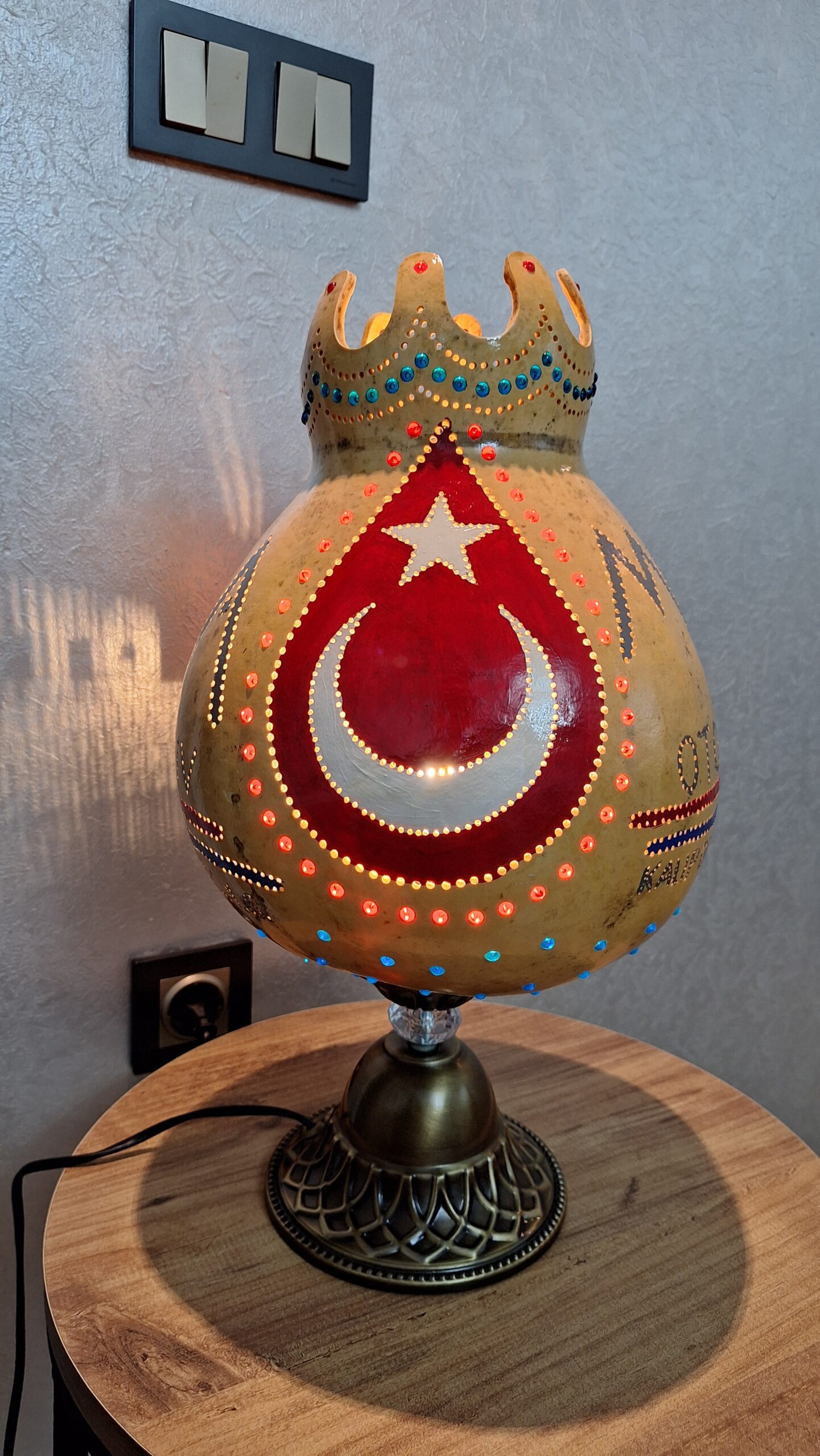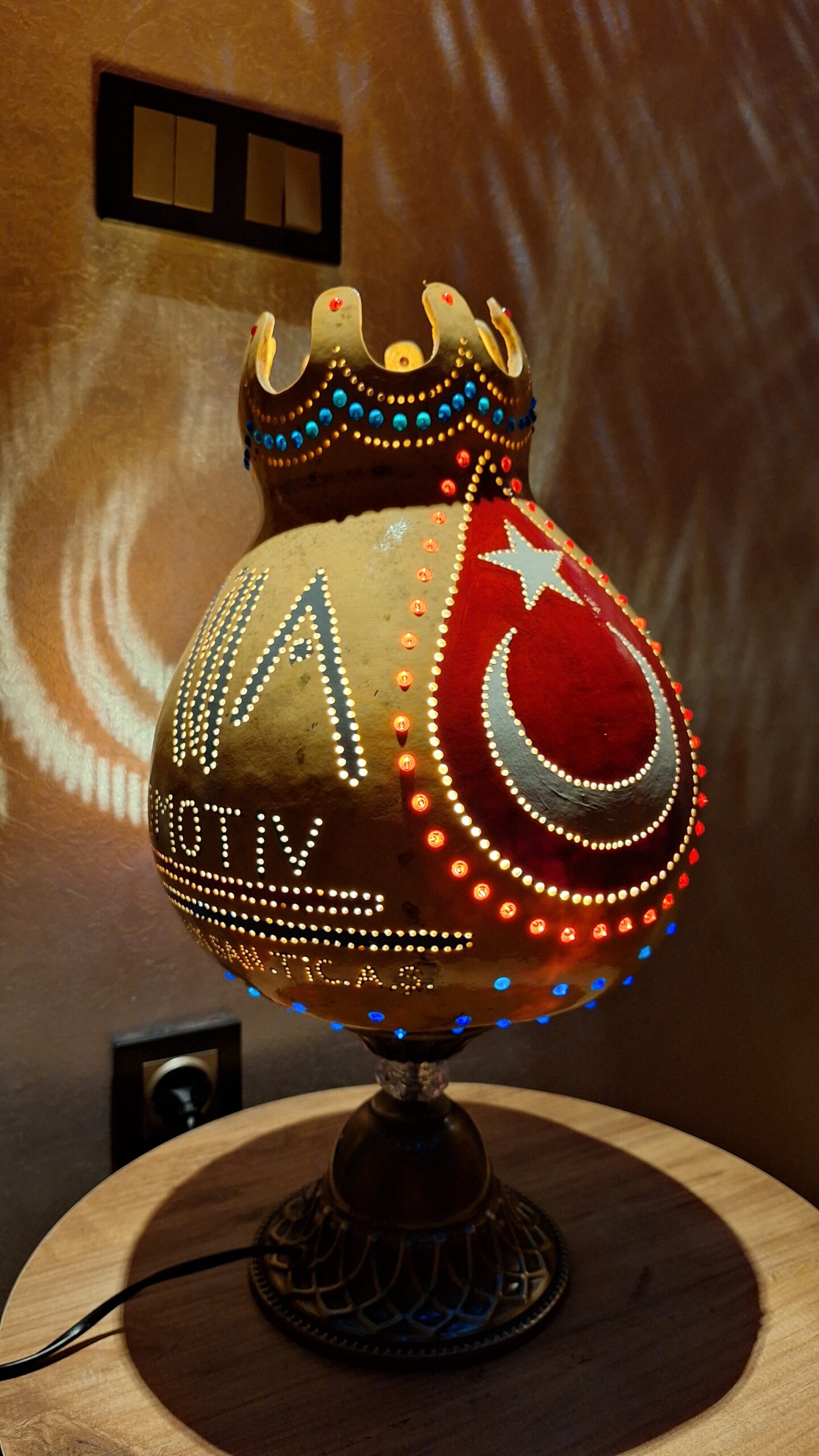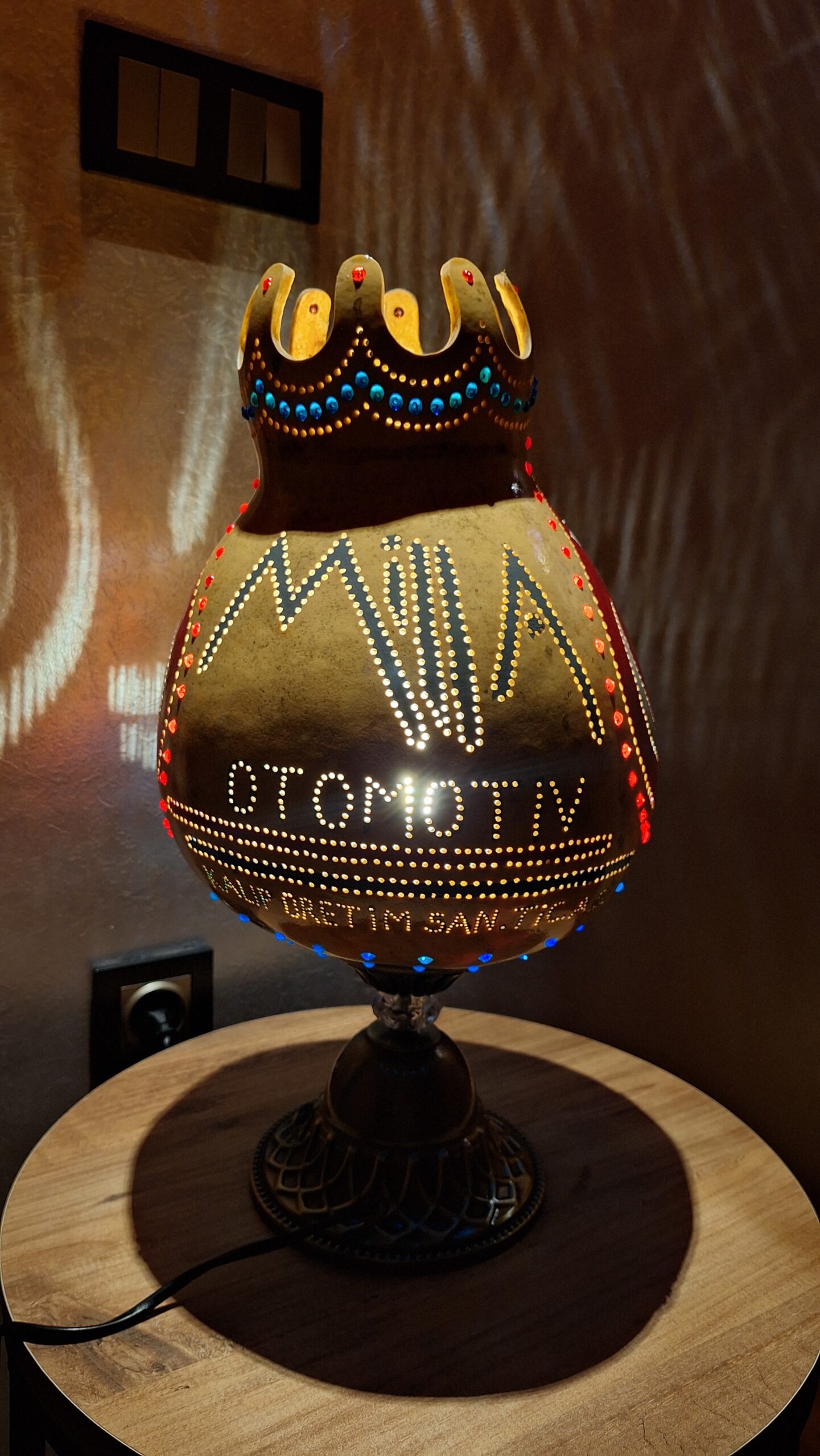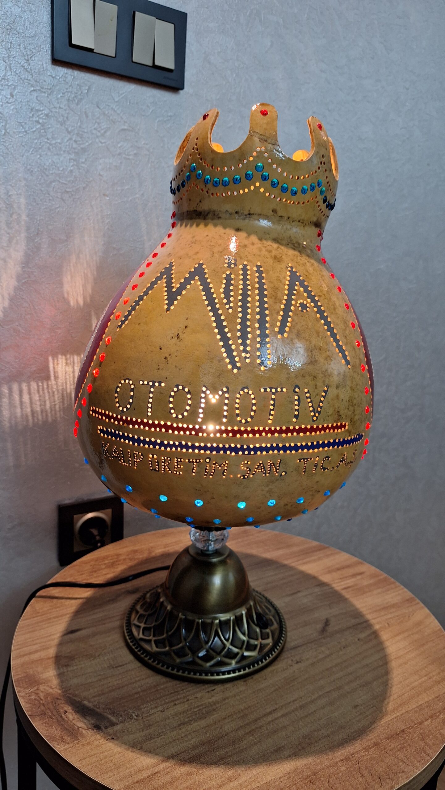 Doğal su kabağının tamamen el işçiliğiyle oyulmasıyla hazırlanan bu özel tasarım abajur, firma logosu ve yazı uygulamasıyla kişiye ya da kuruma özel olarak üretilmiştir.