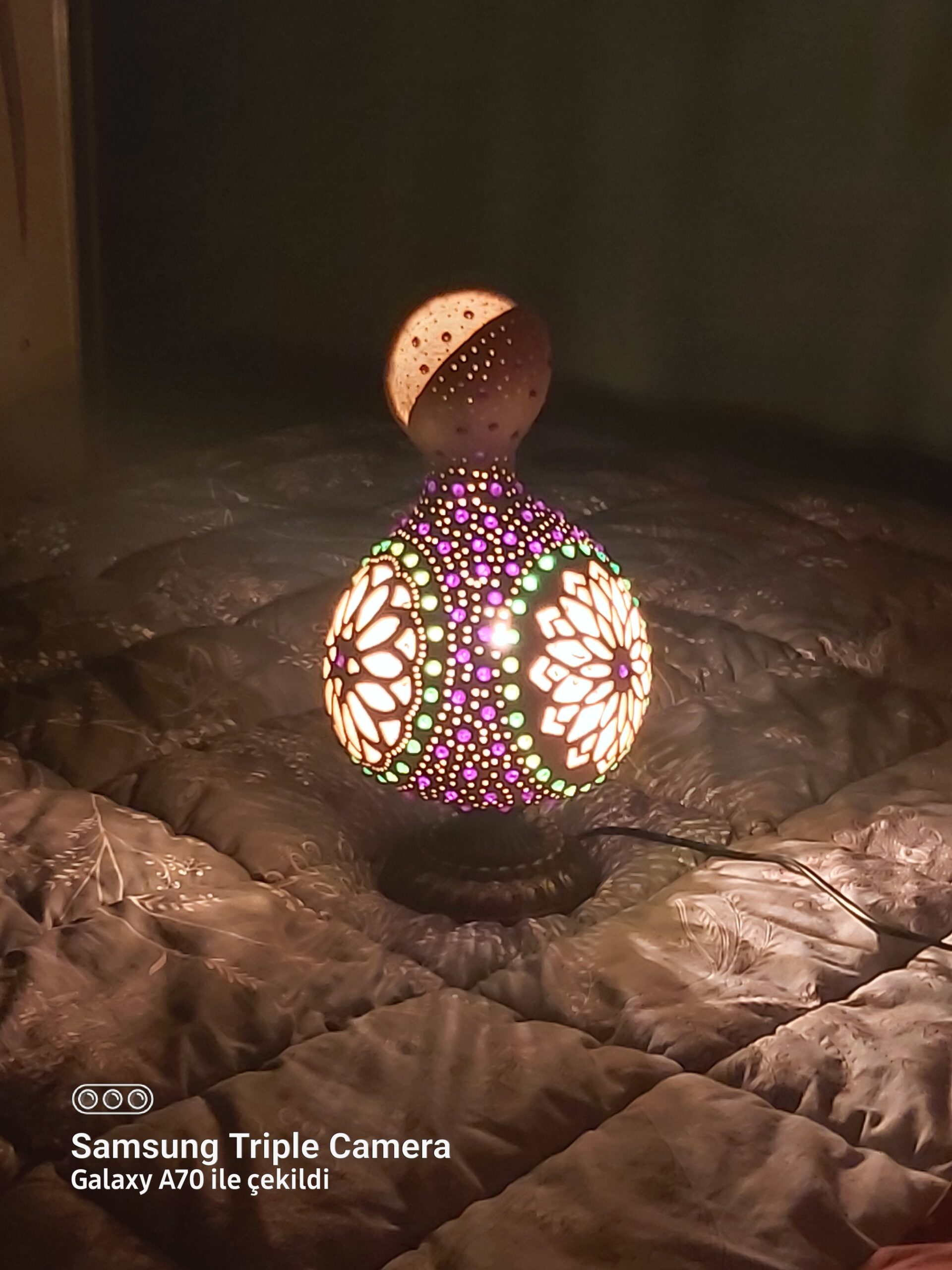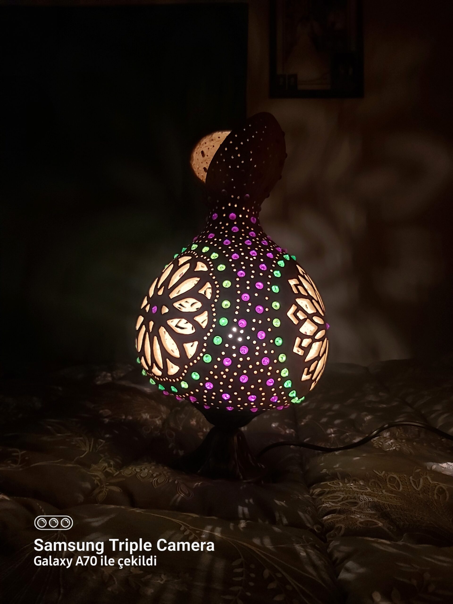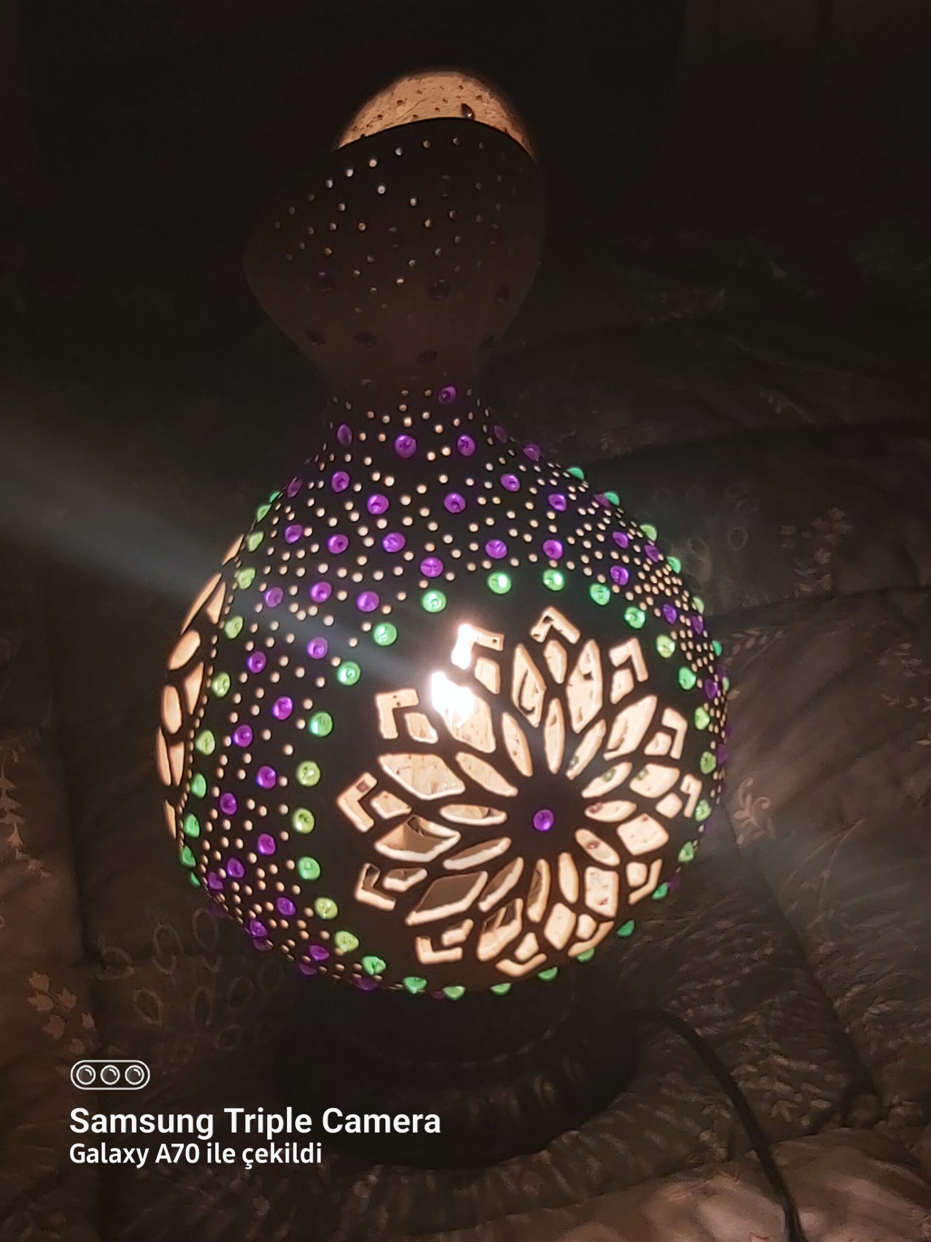 Özel Tasarım Su Kabağı Abajur – Işığın Sanatla Dalgalandığı An  Işığın yapraklar içinde  buluştuğu bir yolculuğa hazır mısınız?Bu özel tasarım su kabağı abajur, tamamen doğal malzemeden elde üretilmiş ve hiçbir hazır şablon kullanılmadan, teknik çizimle tek tek işlenmiş el yapımı bir sanat eseridir. Üzerindeki motifleri ve mavi boncuk detaylarıyla, adeta gecenin içine kişinin huzurunu taşıyor. El işçiliğiyle…