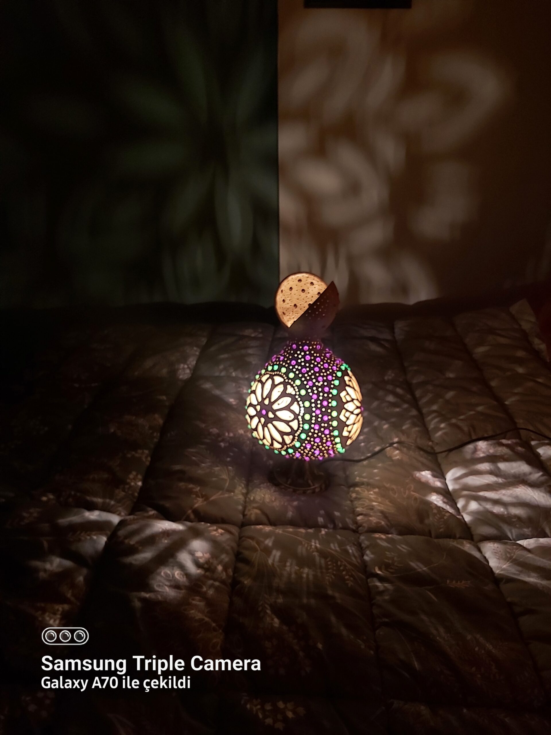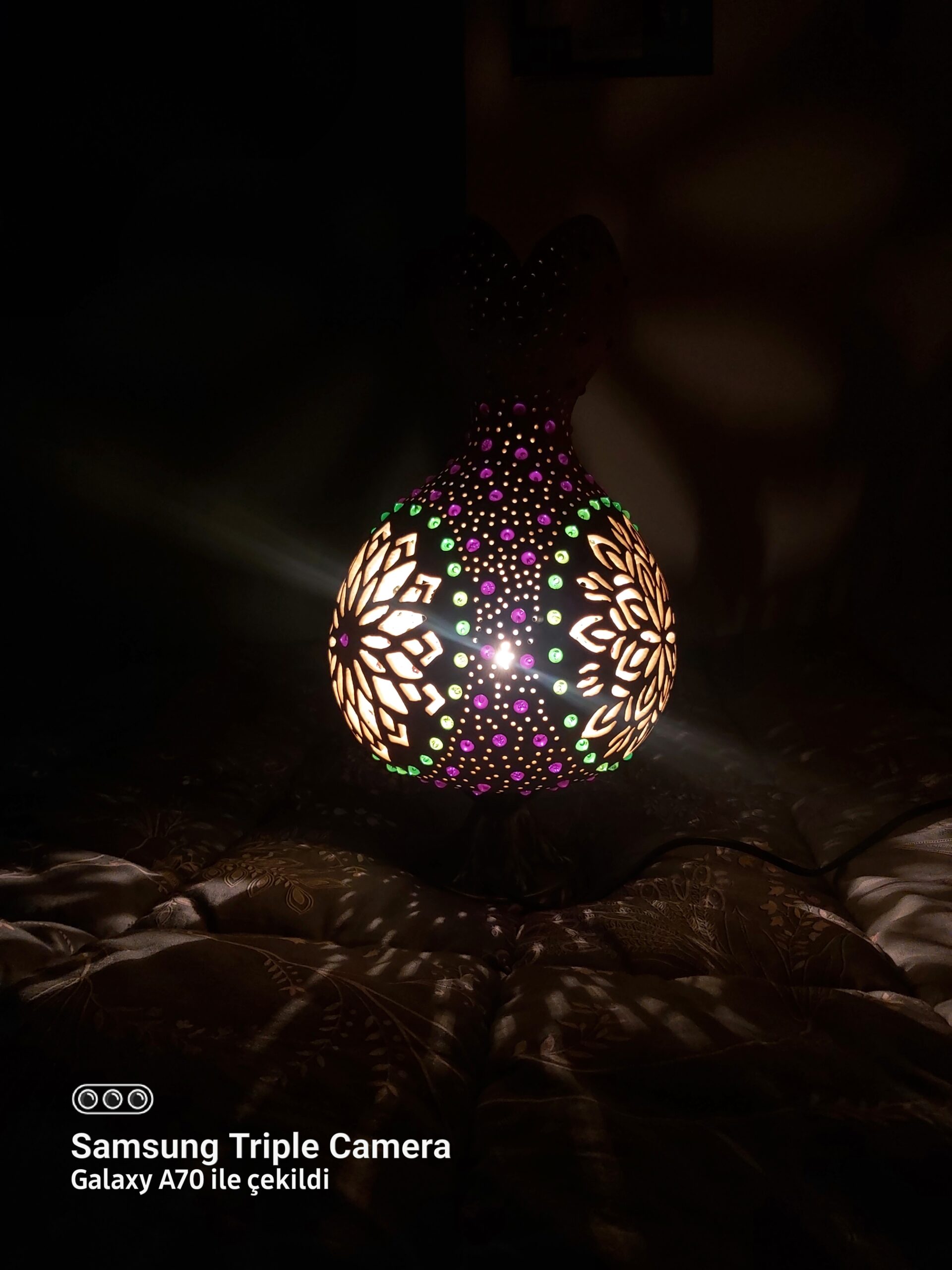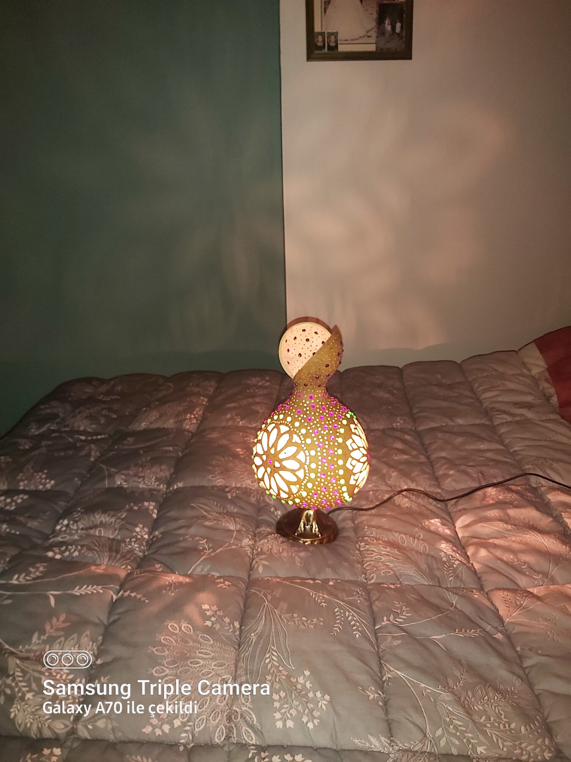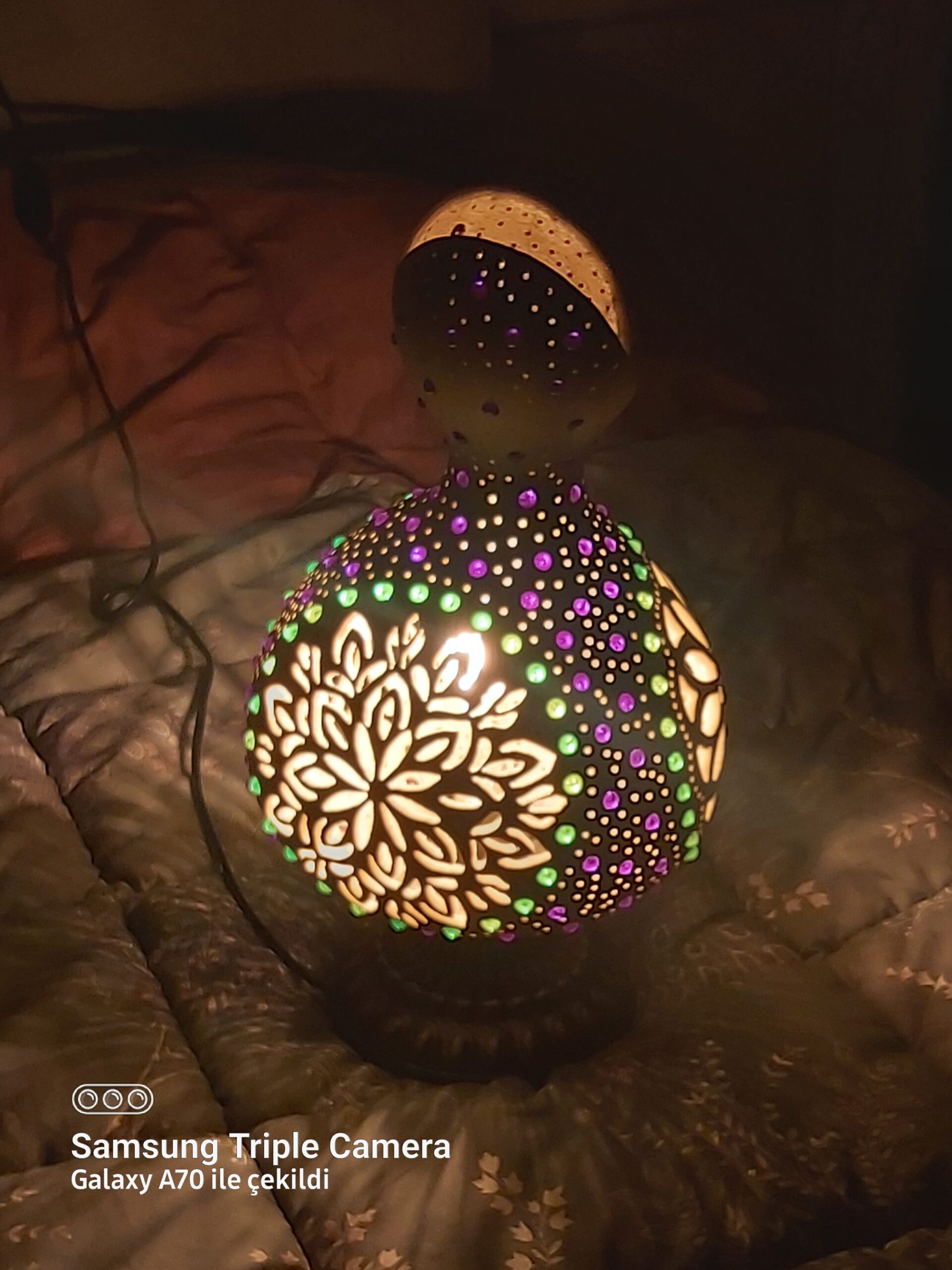 Özel Tasarım Su Kabağı Abajur – Işığın Sanatla Dalgalandığı An  Işığın yapraklar içinde  buluştuğu bir yolculuğa hazır mısınız?Bu özel tasarım su kabağı abajur, tamamen doğal malzemeden elde üretilmiş ve hiçbir hazır şablon kullanılmadan, teknik çizimle tek tek işlenmiş el yapımı bir sanat eseridir. Üzerindeki motifleri ve mavi boncuk detaylarıyla, adeta gecenin içine kişinin huzurunu taşıyor. El işçiliğiyle…